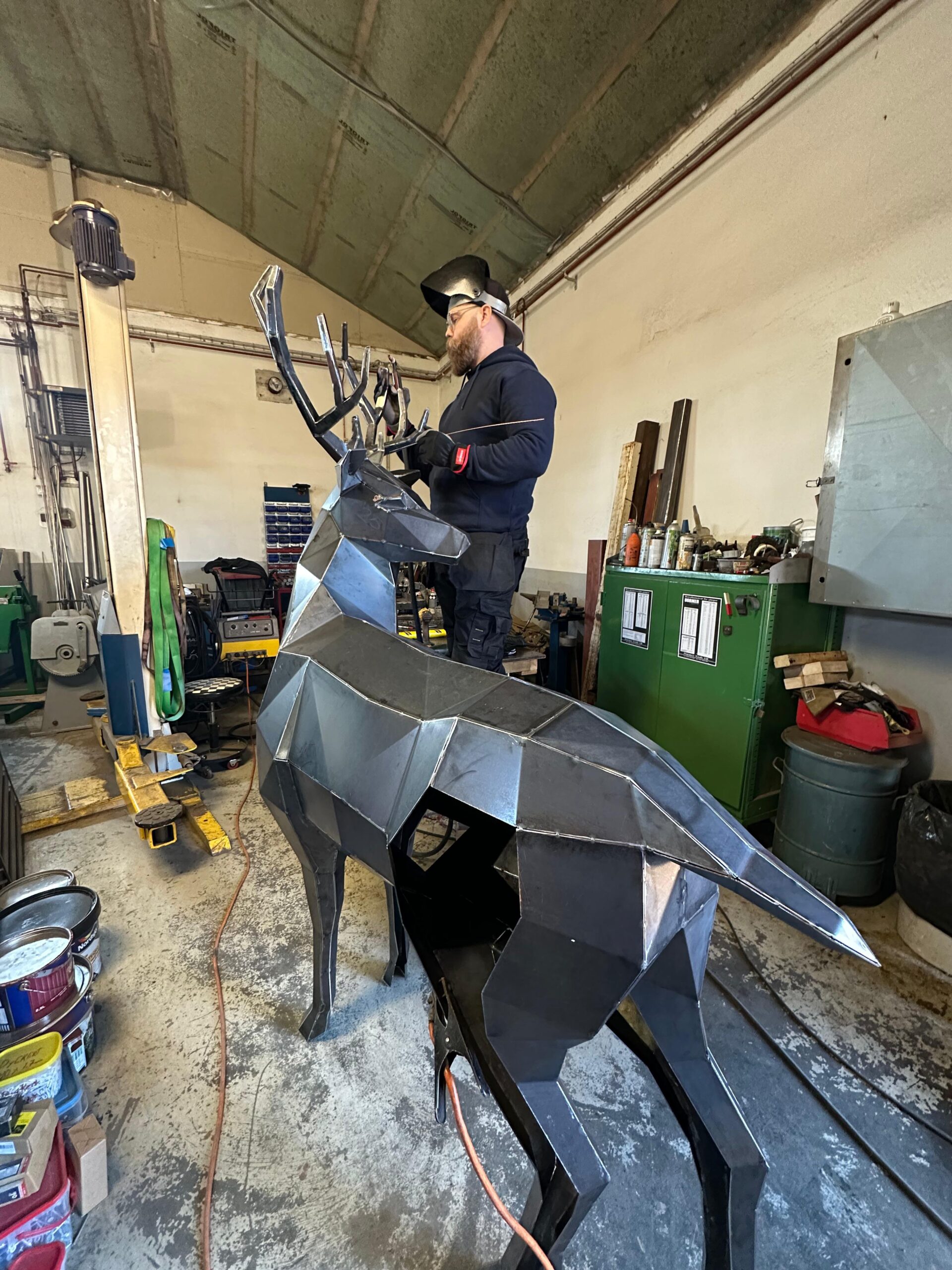 svetsar skulptur i verkstad